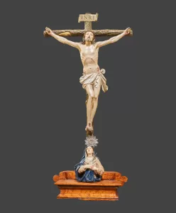 Aquí, Cristo se nos muestra todavía vivo, con tres clavos en cruz leñosa. Destaca la esbeltez de la figura y los excelentes detalles anatómicos.